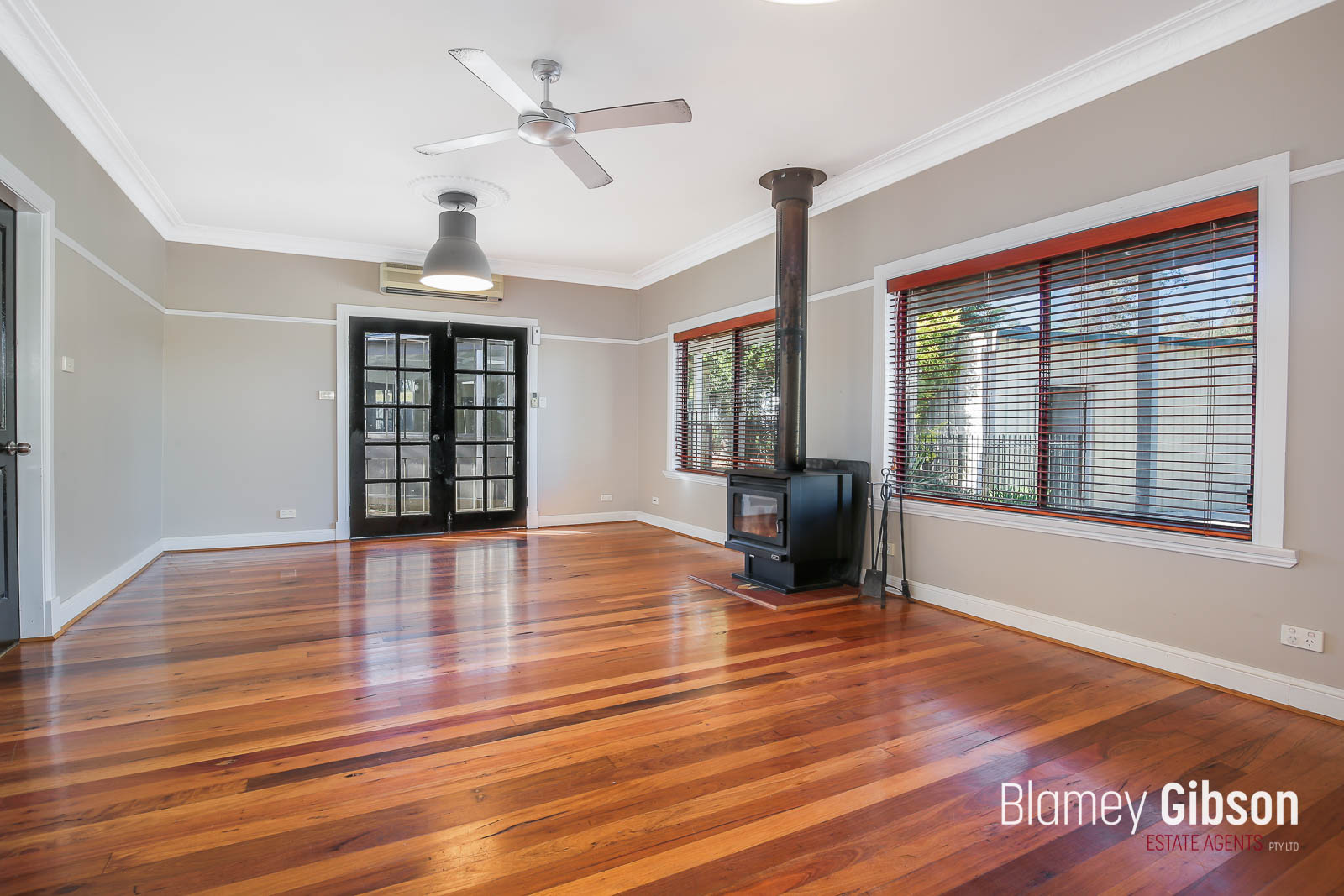 Slow combustion fire place, two reverse cycle split system air conditioning units plus ceiling fans throughout