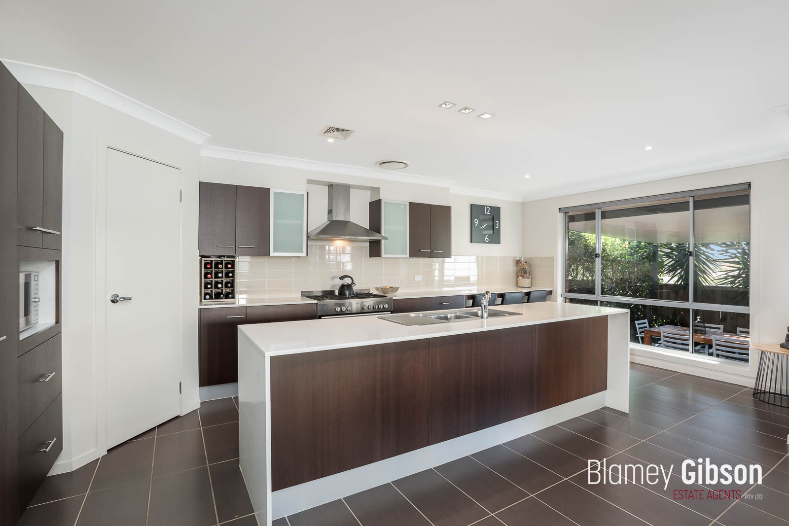 Chef's kitchen with ample bench space, large walk-in pantry, stainless steel appliances and stone bench tops
