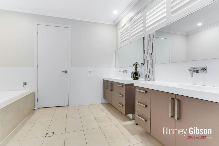 Master bedroom with hidden walk-through robes, full ensuite bathroom including double shower, bathtub and dual basin vanity